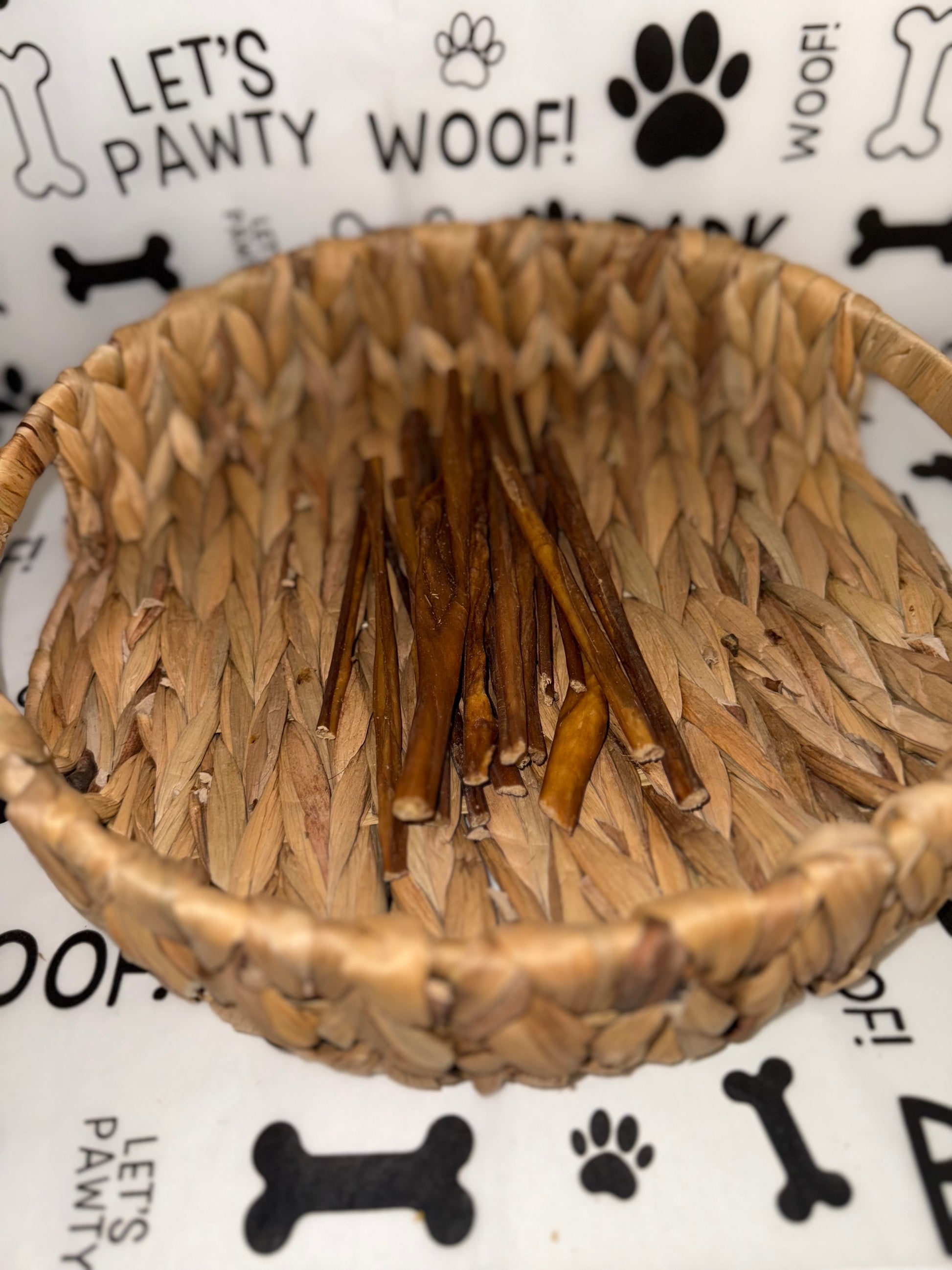 Our Beef Spaghetti is completely natural, 100% beef dog treat. Made from cooked and then air dried cow intestines. This makes for a tasty snack for puppies and dogs all sizes and ages above 6 weeks! It offers chewing pleasure without any risk of large pieces splintering