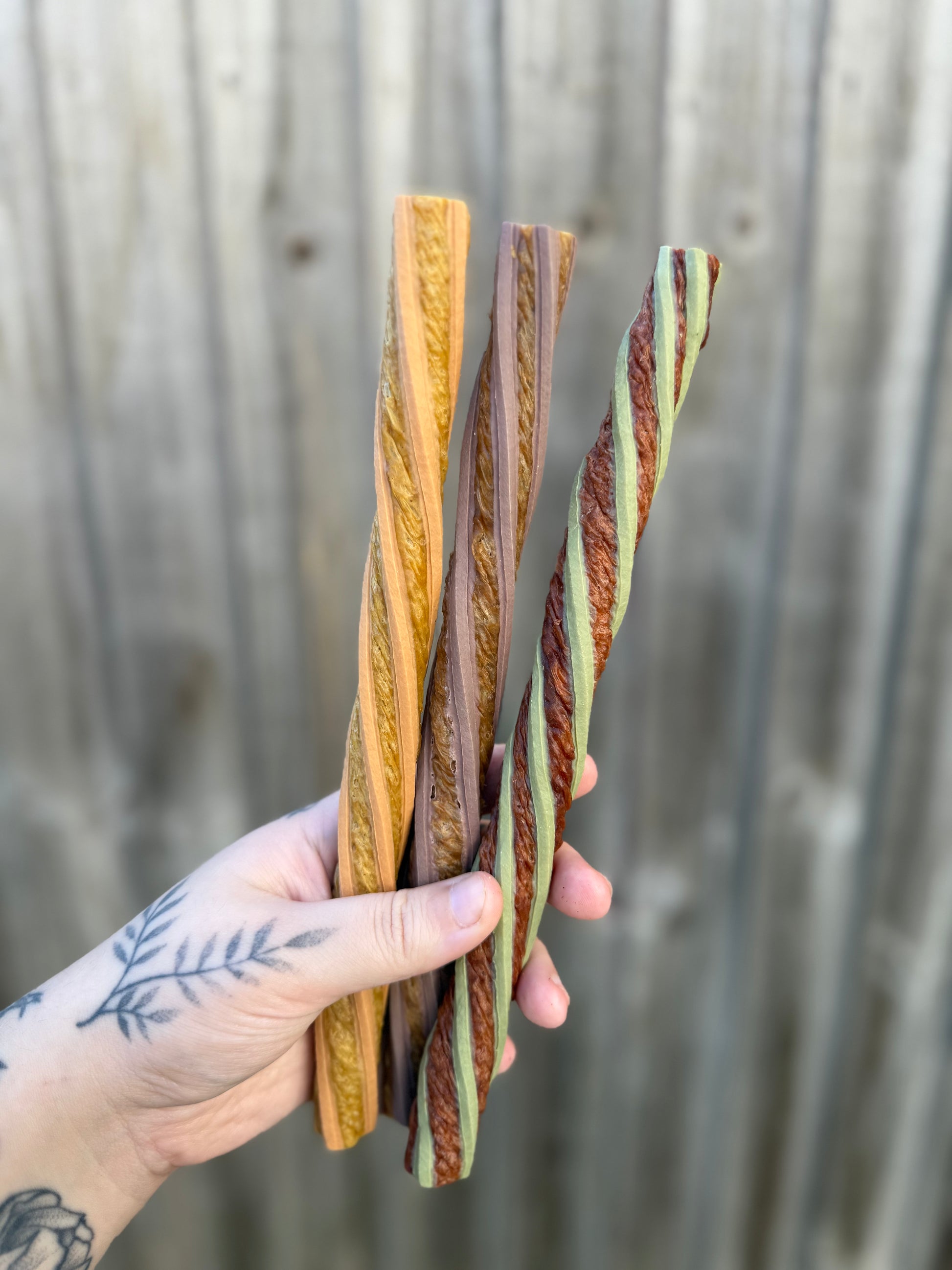 Duck & Sweet Potato - Duck, Sweet Potato Powder, wheat flour, cornstarch, wheat gluten, glycerin, soybean oil, malt syrup.